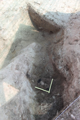 Já na área do alargamento deste ano começámos a escavar o troço de fosso 13b, que corresponderá ao momento mais antigo até agora detectado nos Perdigões. Mas um novo troço de fosso apareceu hoje noutro local (fica para os próximos dias).