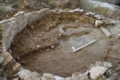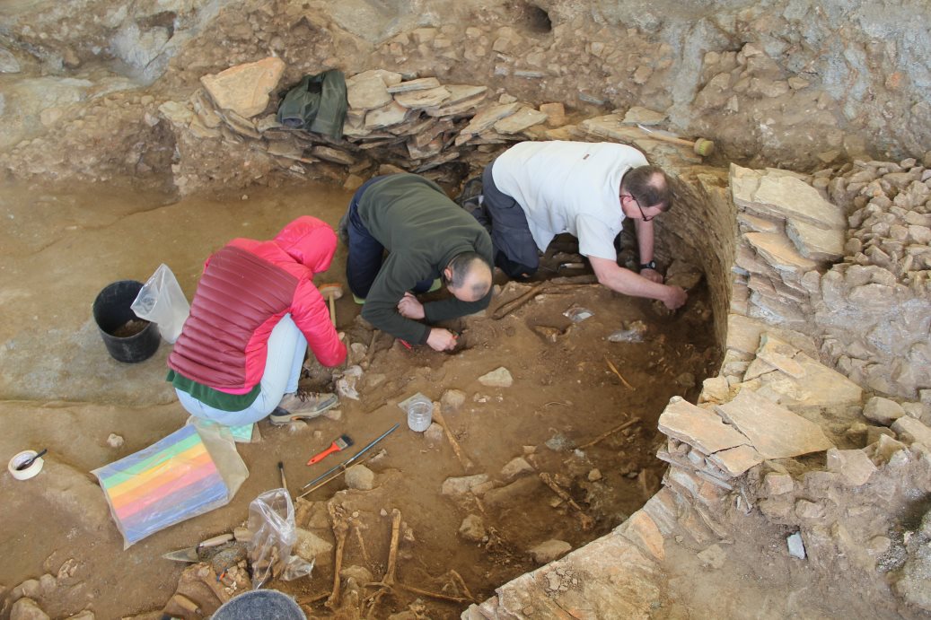 escavação do Sepulcro 4. Sob a deposição de restos humanos existe um outro